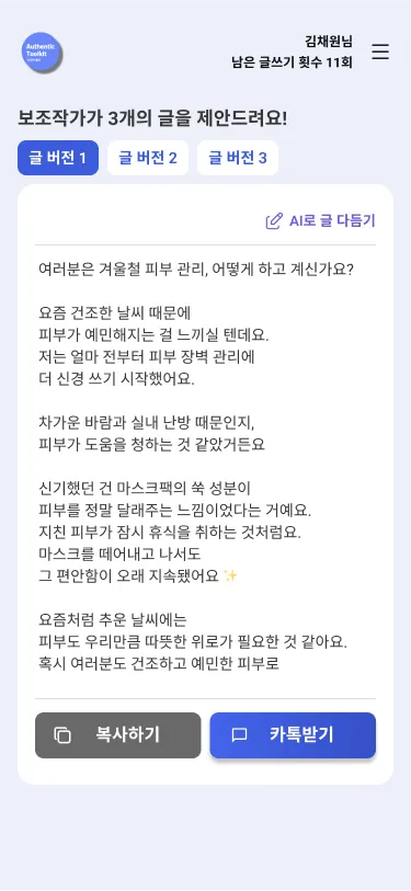 어센틱툴킷은 내 브랜드만의 매력을 표현하는, 브랜딩 보조작가 AI 서비스입니다.