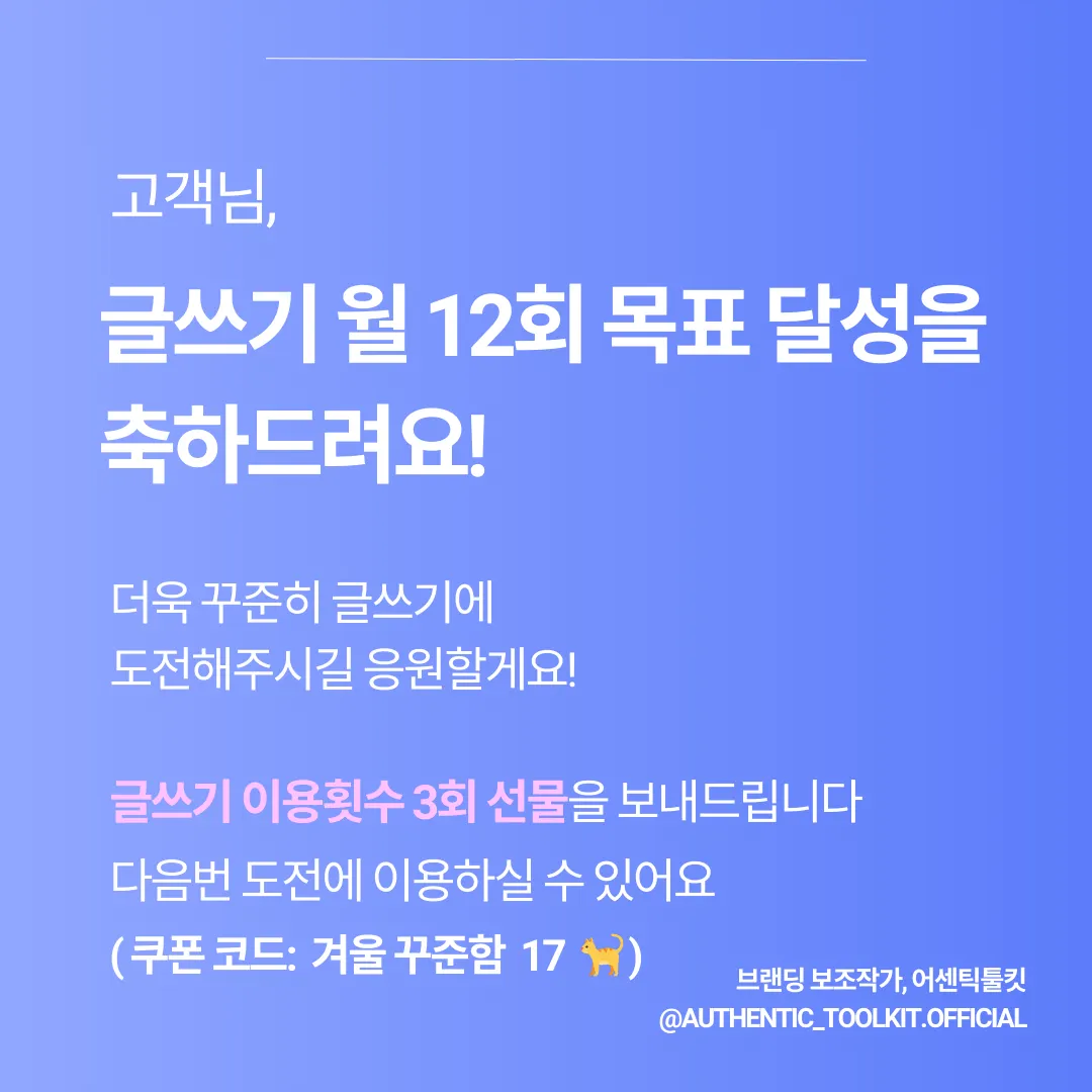 3개월 연속으로 목표를 달성해주시면, 글쓰기 이용횟수 +30회 선물쿠폰을 보내드려요.